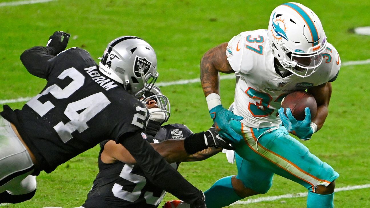 LAS VEGAS -- Miami Dolphins running back Myles Gaskin pulled his best BeastMode impression breaking tackles of three Raiders defenders within 10 yards as he took a screen pass in for a touchdown to tie the game 13-13.